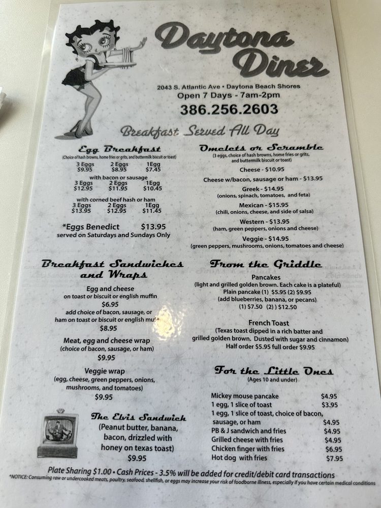 Daytona Diner is a nostalgic 50's diner located in Daytona Beach Shores, FL, known for its great breakfast and brunch options. The atmosphere is cozy, with Betty Boop memorabilia and a view of the ocean. The menu offers traditional diner food, including the popular Elvis sandwich. Despite some minor pricing issues with credit card fees, the overall value is good. The service is friendly and efficient, with dishes coming out hot and as ordered. The diner offers a variety of options for vegetarians and is wheelchair accessible. With its casual and quiet ambiance, Daytona Diner is perfect for families and groups looking for a relaxed dining experience. Whether you're craving a classic omelet, biscuits, or a Mimosa made by Lisa, Daytona Diner is a charming spot to enjoy a satisfying meal.